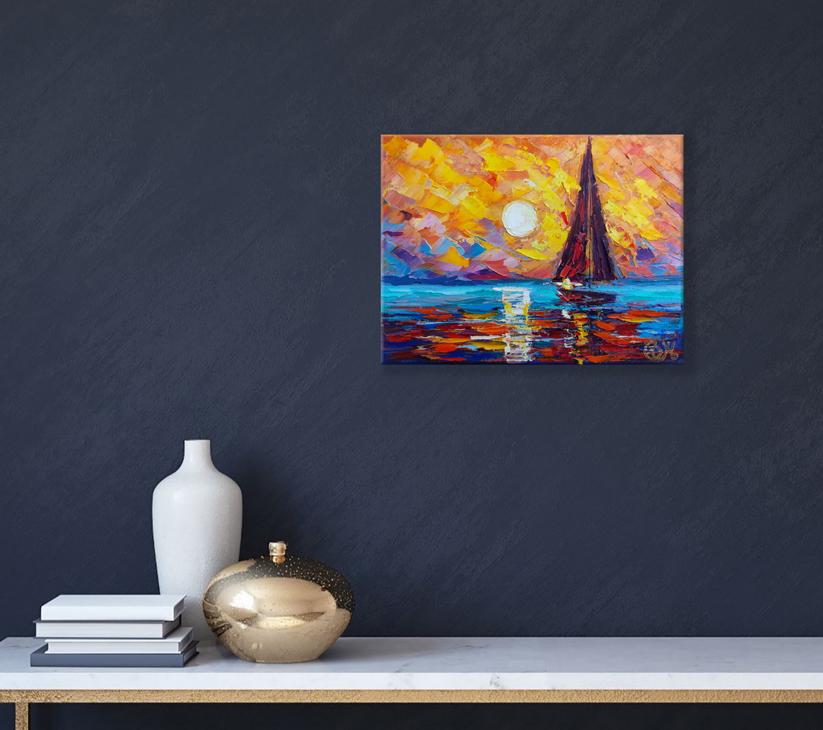 This impasto sailboat seascape oil painting works beautifully in a living room, bedroom, home office, or coastal-inspired interior. It brings a sense of openness and calm, making the space feel more expansive and balanced. The horizontal format allows the painting to sit comfortably above furniture, while its vibrant colors add warmth and energy without overwhelming the room.