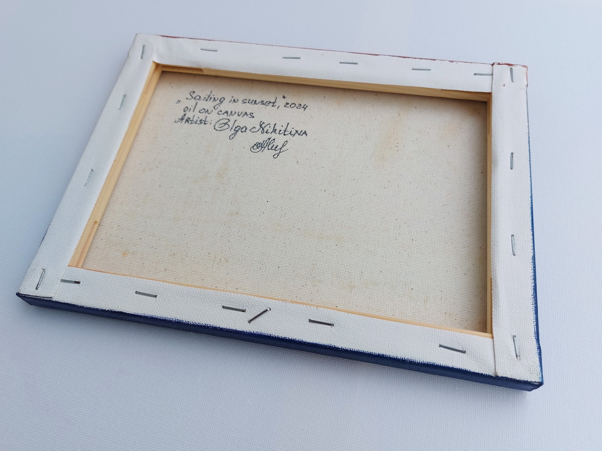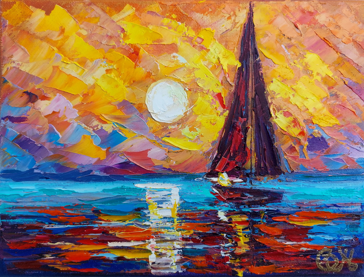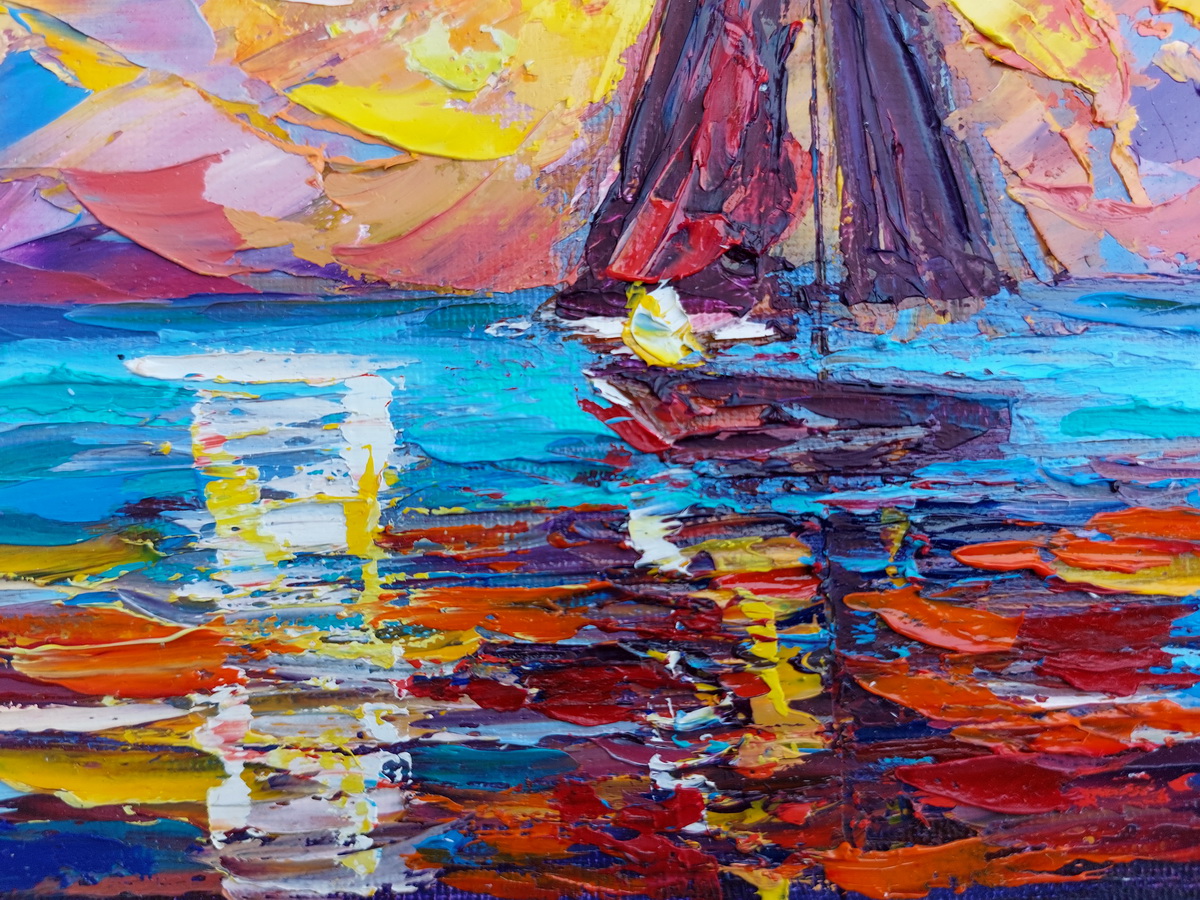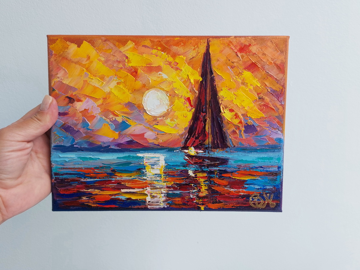 This impasto sailboat painting is created by Olga Nikitina under the name OlgaNikitinArt. It is a tactile, expressive work that celebrates light, movement, and the quiet poetry of the sea.
