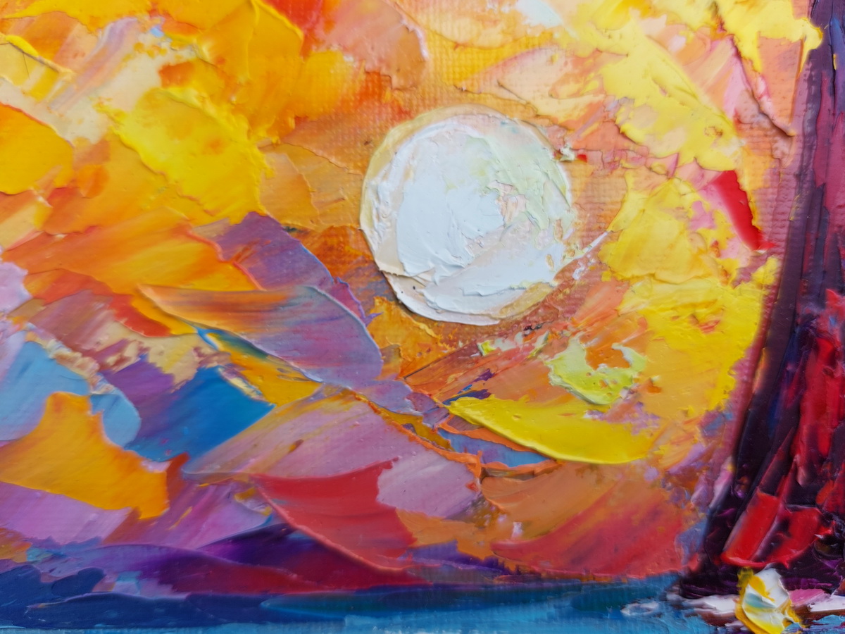 This impasto sailboat painting depicts a sailboat moving across calm water beneath a glowing sky. Created with a palette knife, the painting is built from thick, expressive layers of oil paint that give the surface a sculptural presence. Color, texture, and movement come together to form an atmosphere that feels expansive, warm, and quietly powerful.